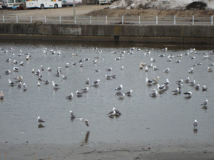 小樽の有名なラーメン屋さんです。テレビで紹介されたこともあるそうです。「札幌ら~めん共和国」にも出店して、実力は申し分なし!麺は太麺♪スープは濃厚でコクがあります。 こってり系が好きな方にはたまらないと思います(@ ̄¬ ̄@)ジュルリ♪ 道路をはさんだ向かい側では、カモメたちがおしゃべりをしていました。写真右上の隅に見える白いものは、まだ解けずに残っている雪です。
